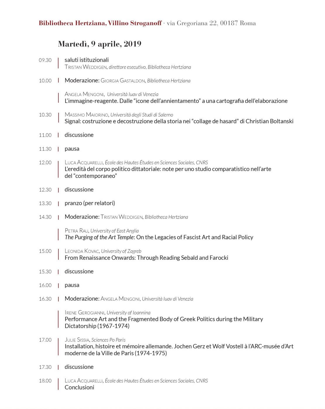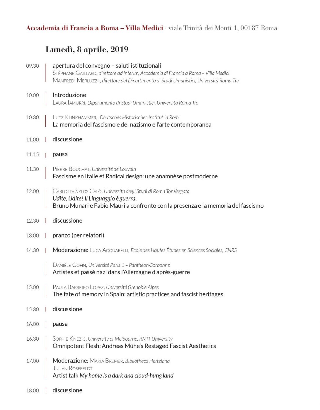 Le conseguenze storiche del fascismo hanno avuto un ruolo importante nella formazione del progetto politico europeo. La memoria del fascismo ha avuto un impatto talvolta violento, talvolta più sottile e complesso, tanto sulla vita quotidiana dei cittadini europei quanto sull’elaborazione intellettuale. Interrogare la storia è stato per molti artisti un modo per affrontare la memoria del passato traumatico sia nei termini di un confronto sporadico, sia facendo di quell’interrogativo l’oggetto centrale del loro lavoro. Dopo il convegno internazionale organizzato a Roma nel 2018, dedicato al Fascismo italiano nel prisma delle arti contemporanee.